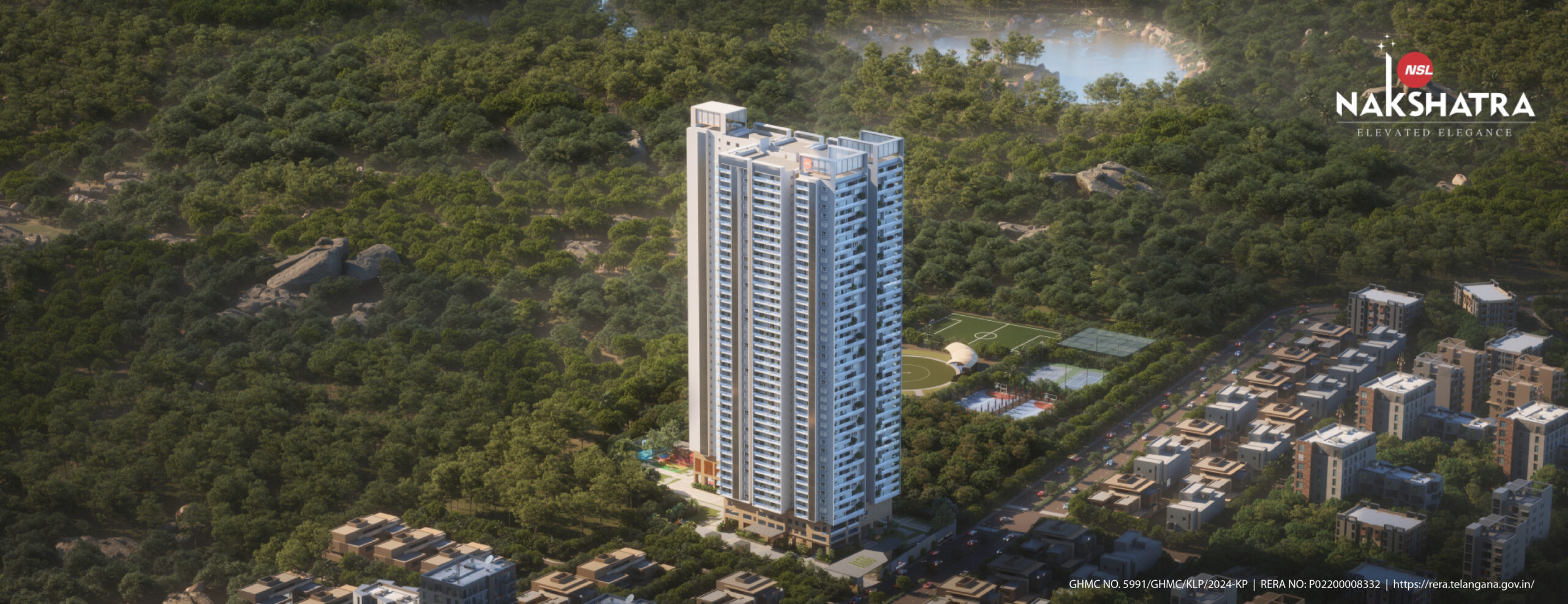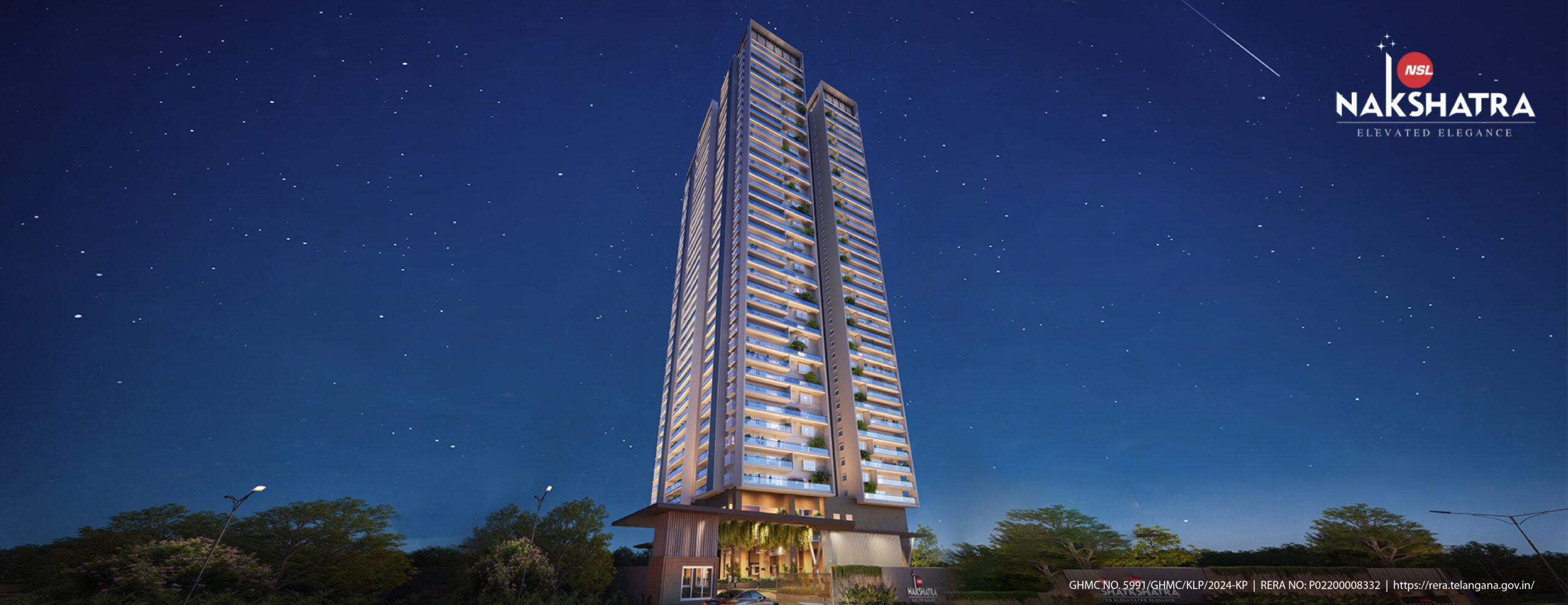NSL Nakshatra is an ultra-premium tower residency in the prime location of KPHB abutting 875 acres of lush green lung space, surrounded by well-matured social infrastructure. This one-of-its-kind Ground + 40-Storey highrise takes aspirations sky-high, where you have the privilege of living in one of the tallest towers in the vicinity. Imagine a view of the bustling city skyline or picture the ethereal spectacle of stars from the rooftop, where the city's pulse meets the sky's embrace.