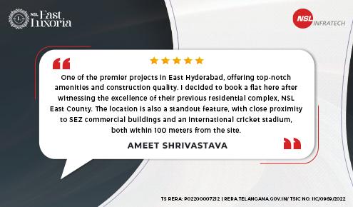 NSL East Luxoria is a crescendo in the clouds, a symphony of class and luxury reserved for the privileged few who would love to ‘Live it Up’ in the East. The two tallest twin towers in the Eastern Vector—majestic slit+44 high rise with 80,000 sft of royal amenities—are the true trendsetters in Hyderabad Realty. State-of-the-art clubhouses with two swimming pools, landscaped decks, luxurious green spaces, and world-class indoor and outdoor sports facilities make for a lavish lifestyle beyond words.