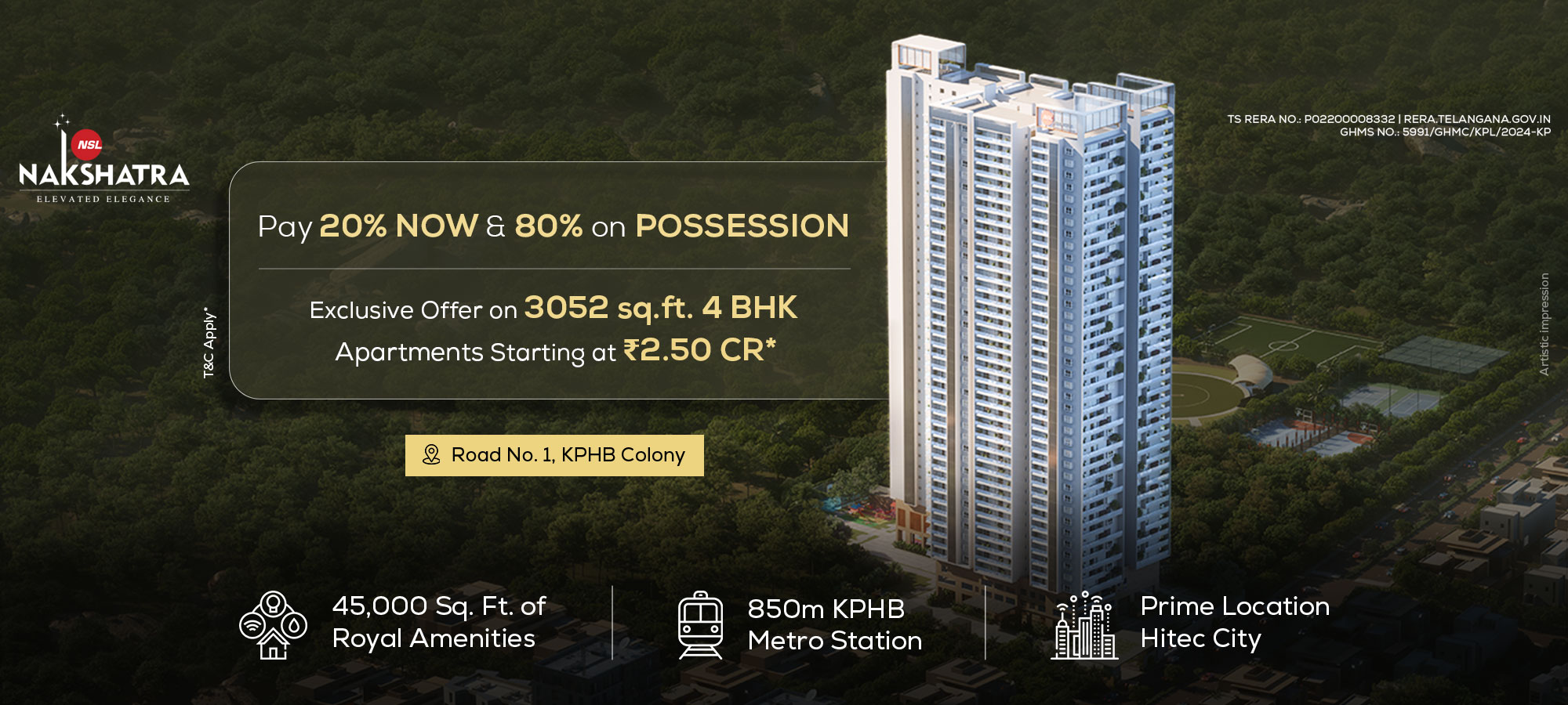 NSL Nakshatra is an ultra-premium tower residency in the prime location of KPHB abutting 875 acres of lush green lung space, surrounded by well-matured social infrastructure. This one-of-its-kind Ground + 40-Storey highrise takes aspirations sky-high, where you have the privilege of living in one of the tallest towers in the vicinity. Imagine a view of the bustling city skyline or picture the ethereal spectacle of stars from the rooftop, where the city's pulse meets the sky's embrace.